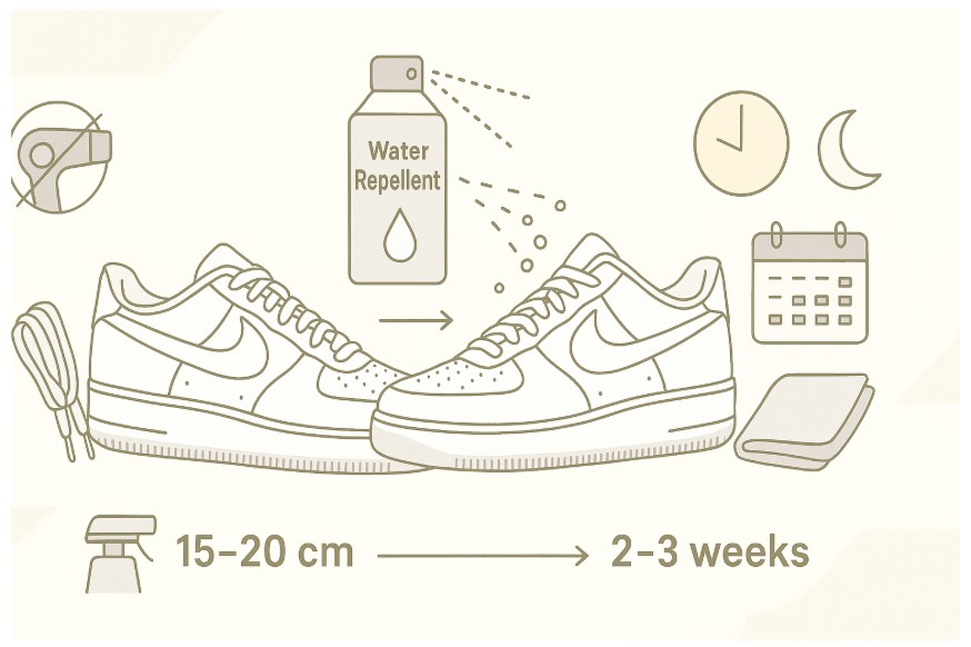 - Распылите средство (Crep Protect или Nikwax) с расстояния 15–20 см, равномерно покрывая всю поверхность.