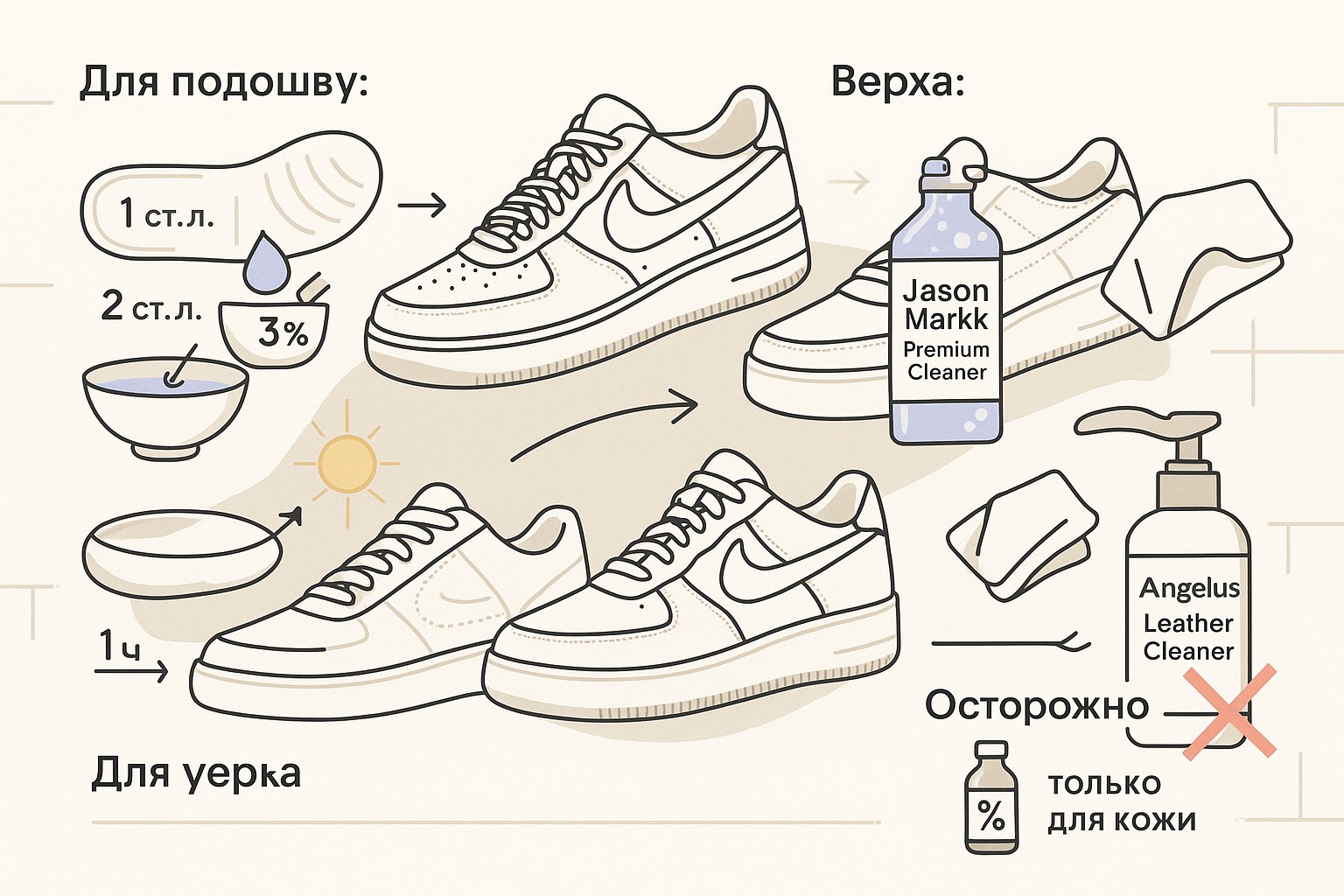 Совет: Если сомневаетесь в материале — проверьте этикетку внутри кроссовок. Для кожи, ткани и синтетики подходят разные методы очистки.